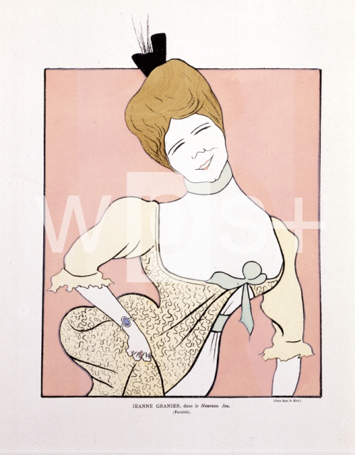 備考|フランスの劇作家、アンリ・ラヴダン作(Henri Lavedan, 1859-1940)、「新しい遊び(Le Nouveau Jeu, 1898年)」に出演した女優・ソプラノ歌手、ジャンヌ・グラニエ(Jeanne Granier, 1852-1939)のイラスト。※「ラ・レヴュ・ブランシュ(La Revue Blanche)」に現れる色々なパリの女優のカリカチュア的な刷り込み型イラスト。