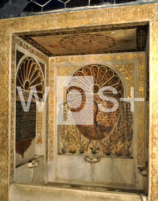 備考|花枝やチューリップ、カーネーションの中に孔雀を描くのはムラト3世当時の流行だった。左右壁の銘:タリク書体。