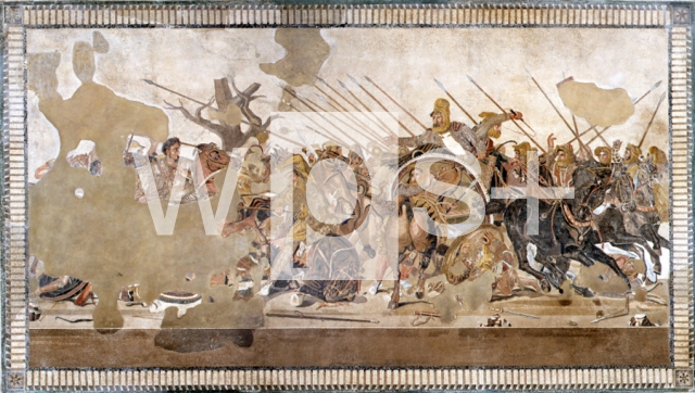 備考|部分。マケドニア王国のテメノス朝の王・アレクサンドロス大王(在位336-323BC)とペルシア帝国アケメネス朝最後の王・ダレイオス3世(在位336-330BC)との戦い。※ファウヌス家のモザイク。ポンペイ出土。
